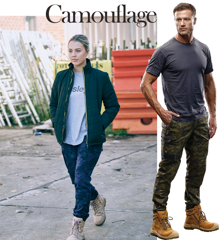 카모플라주는 본래 군용 위장 패턴으로 시작했지만, 이제는 스트리트와 워크웨어 스타일 모두에서 강렬한 존재감을 뽐내는 패션 아이콘이 되었다. 실용적인 의미뿐 아니라 스타일리시한 포인트로 활용된다. 카모플라주의 대표격인 국방 패턴 외에 다양하게 변주된 색상과 패턴이 있어 취향에 맞게 선택 가능하며 어느 옷에 매치해도 개성을 뚜렷하게 드러낸다. 특히 워크웨어 특유의 견고한 원단과 만나면 기능성과 멋스러움이 자연스럽게 어우러져, 도심 속에서도 강인한 분위기를 자아낸다. 재킷, 팬츠, 모자 등 어느 하나 빠지지 않고 활용 가능하며, 계절과 상관없이 꾸준히 사랑받는 스타일이다.