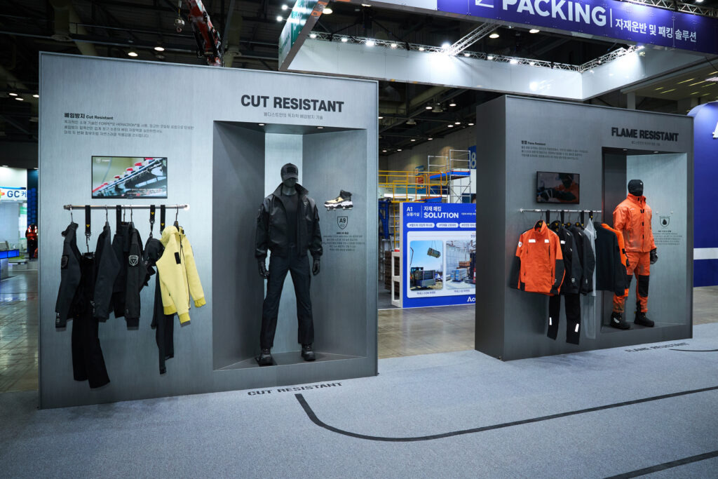 현대자동차와 함께 하이테크센터 근로자를 위한 기능성 충격방지 모자인 ‘세이프티캡(SAFETY CAP)’을 개발한 바 있다. 더 넓은 시장으로의 진출을 위해 이번 ‘2025 스마트안전보건박람회(국제안전보건전시회, KISS)’에 참가하여 부스 전시를 기획하게 된 것이다. 전시의 시작점인 ‘브랜드 존’에서는 50년 이상 축적된 코오롱의 섬유 소재 기술력을 바탕으로 자체 개발한 아라미드 섬유 ‘헤라크론(HERACRON®)’과 베임 방지 및 냉감 기능성 소재 ‘포르페(FORPE®)’가 적용 된 제품들을 선보인다. 또한 실제 산업 현장의 작업 특성과 직군별 니즈를 반영한 네 가지 특화 라인업을 선보인다.