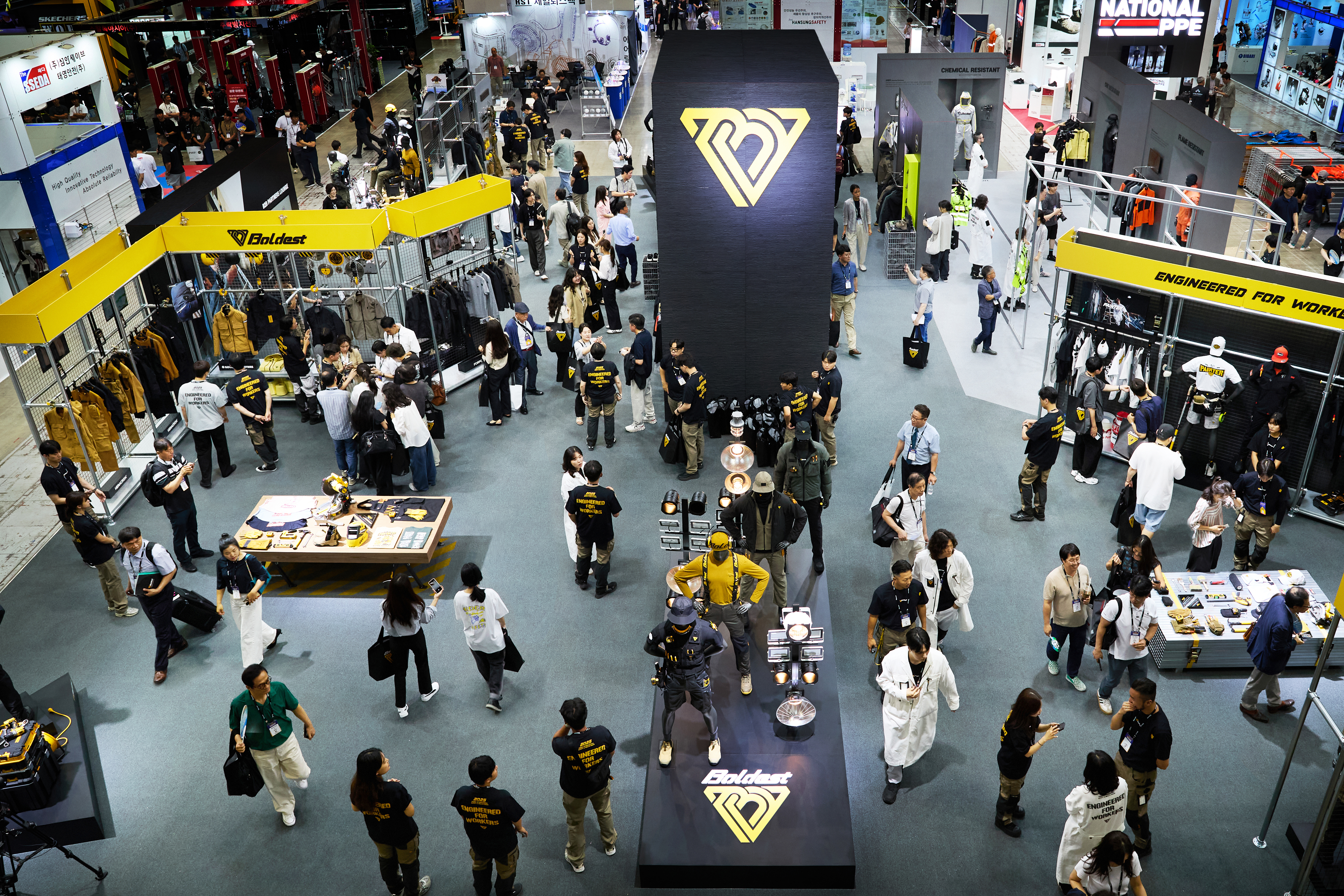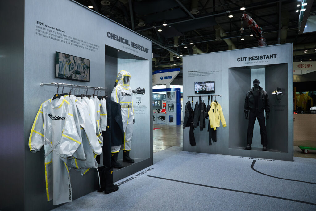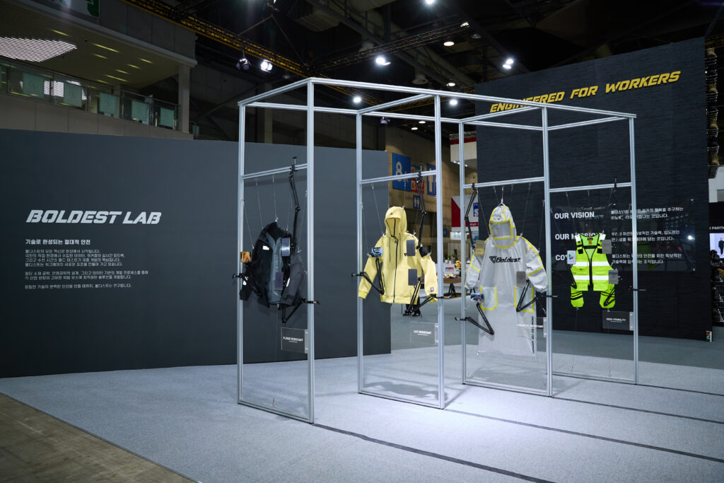 기술력을 집약한 ‘볼디스트랩 존(R&D)’은 방염, 베임방지, 고가시성, 내화학 등 네 가지 핵심 보호 기능 별로 구획된 전시를 통해 실제 적용 사례를 시각화한다. 방염(Flame Resistant) 존에서는 아라미드 원료를 정밀 혼합해 개발한 복합소재 헤라윈(HERAWIN)을 중심으로, ISO 11612 및 화염 마네킨 테스트(ISO 13506-1)를 통과한 거친 방염 솔루션을 선보인다. 해당 소재는 400℃ 이상의 고온에서도 형태를 유지하며, FR Stretch 기술을 통해 착용 유연성까지 확보한 것이 특징이다. 베임방지(Cut Resistant) 존에서는 포르페, 헤라크론, 텅스텐을 삼중 코일링한 독자 원사를 적용한 제품이 전시된다. ANSI A9, EN388 등급을 충족하며, 0.0185mm의 초미세 텅스텐 원사를 활용해 보호 성능과 착용감의 균형을 최적화했다. 고가시성(High–Visibility) 존은 형광칩과 재귀 반사 테이프를 적용한 제품군으로 구성된다. ECLAT사와 협업한 형광칩은 세탁 후에도 색상 견뢰도를 유지하며, 제품의 기능 수명을 늘리고 다양한 산업 환경에서의 가시성과 호환성을 확보했다. 내화학(Chemical Resistant)존에서는 볼디스트만의 인체공학패턴(Engineered Division)을 적용한 내화학복과 고어텍스 엑스트라가드 (GORE-TEX® EXTRAGUARD) 소재로 만든 내화학 안전화를 선보인다. 특히 초음파 웰딩 방식으로 제작된 내화학복은 고위험 화학물질의 침투를 효과적으로 차단한다.